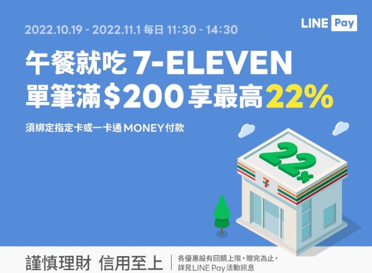 LINE Pay與一卡通MONEY優惠來了!!在統一超商 7-11 消費的滿額回饋活動,使用LINE PAY以及一卡通MONEY付款,單筆結帳金額滿200元就享有22%回饋。