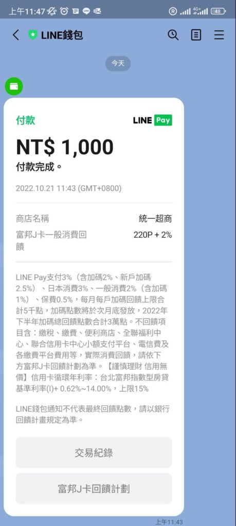 優惠四:[台北富邦加碼]選擇使用已綁定的富邦J POINTS卡/JU卡付款,再享LINE POINTS 10%回饋,與優惠二合計享最高22%回饋