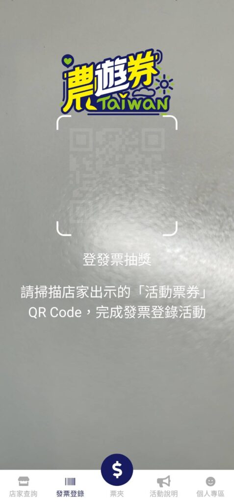 消費完成開啟農遊券APP,點擊「發票登錄」,店家會提供「活動票券」QR CODE進行登錄頁面,填寫該筆發票號碼、發票金額、農遊券使用金額(依實際抵扣金額填寫)後,並拍照發票上傳。