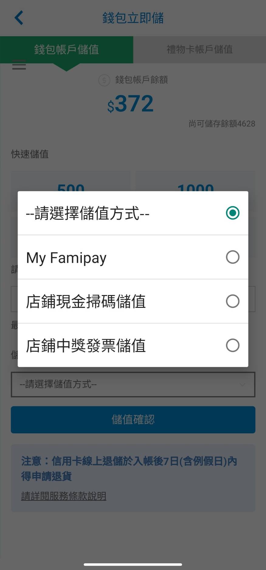 餘額不滿500元可以透過綁定信用卡的My Famipay、店鋪現金掃碼儲值、店鋪中獎發票儲值等三種方式。