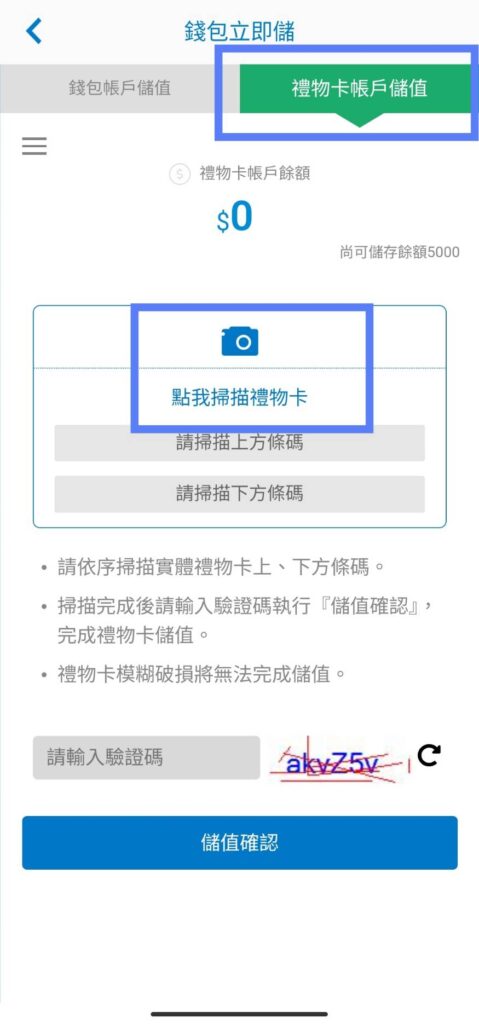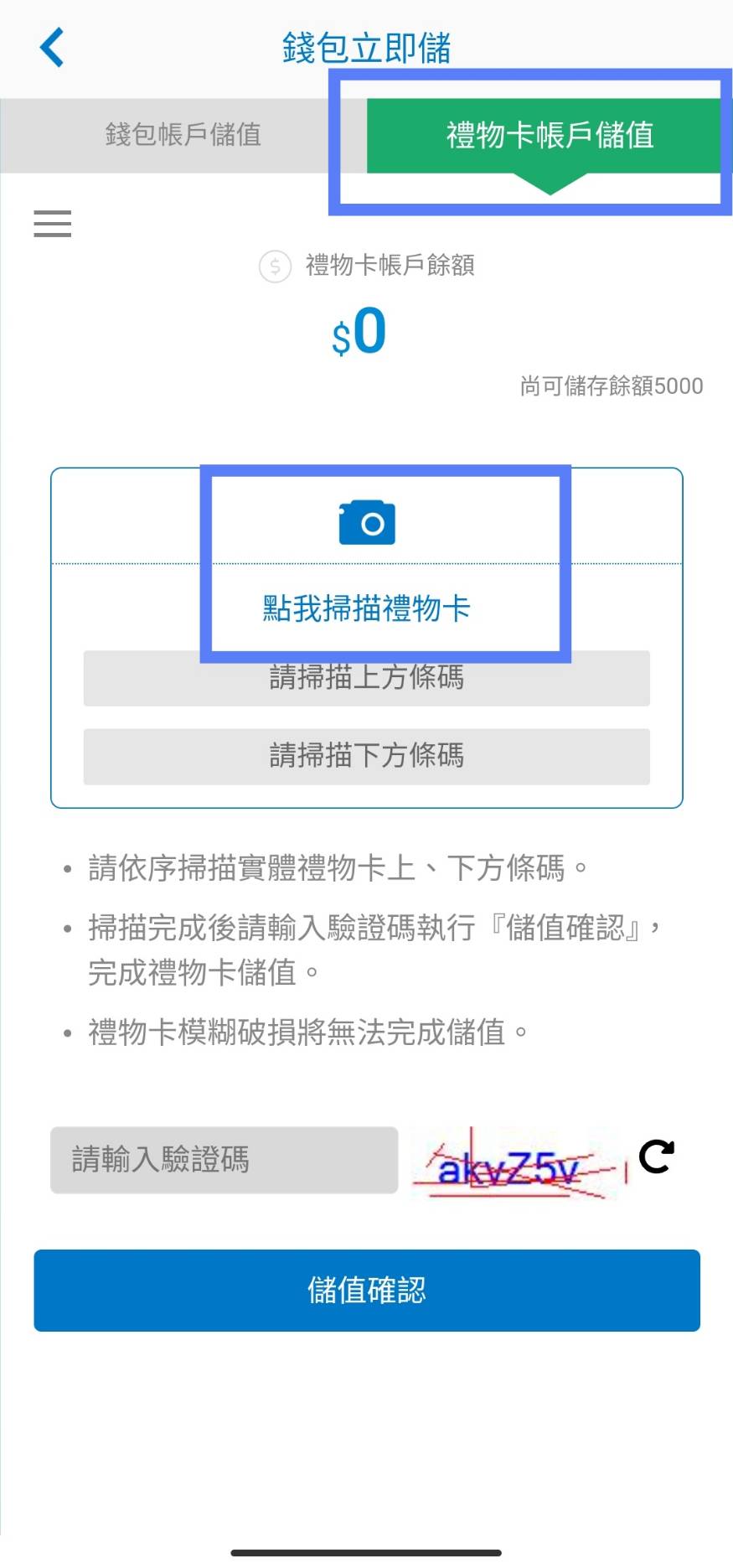 由於禮物卡輸入條碼有二行,要依序掃碼入錢包APP,錄影示範如何方便快速儲值禮物卡至錢包內。