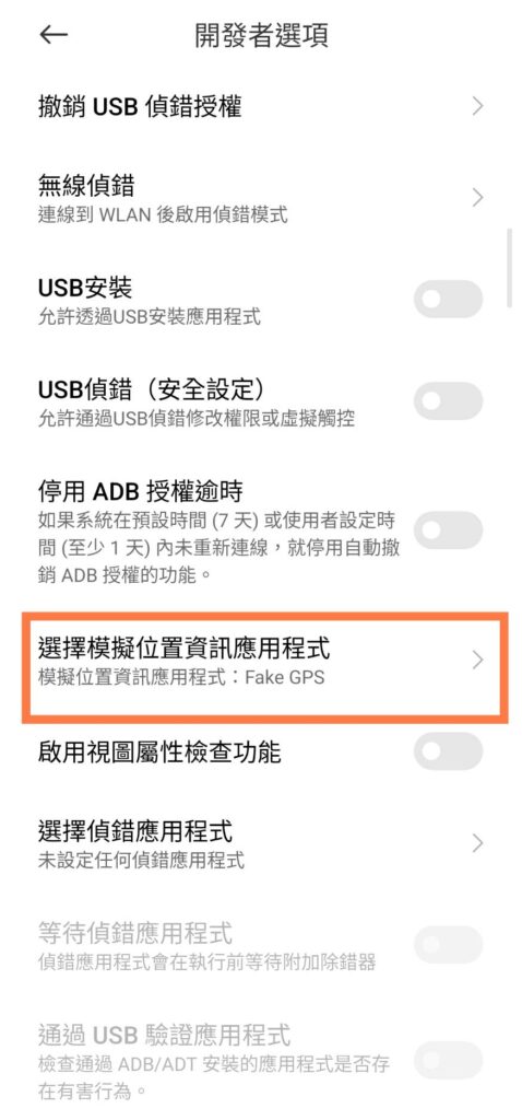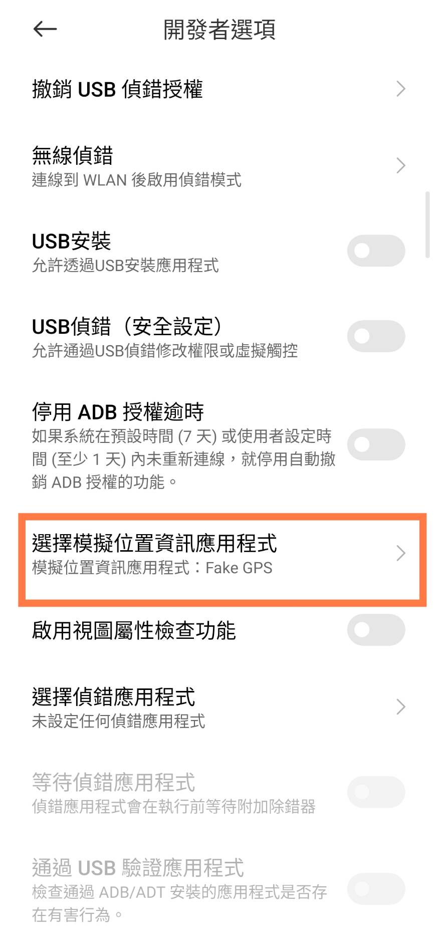 開啟開發人員模式: 設定>手機版本連按7下後進入「選擇模擬位置資訊應用程式」,改為Fake GPS