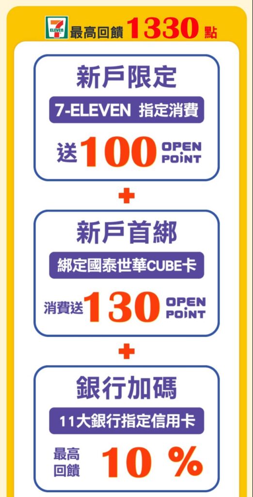 這邊特別推薦綁定國泰世華的CUBE卡,除了新戶先到7-ELEVEN指定消費送100點open point外,首綁加贈130點open point,再加上其他銀行優惠疊加最划算。