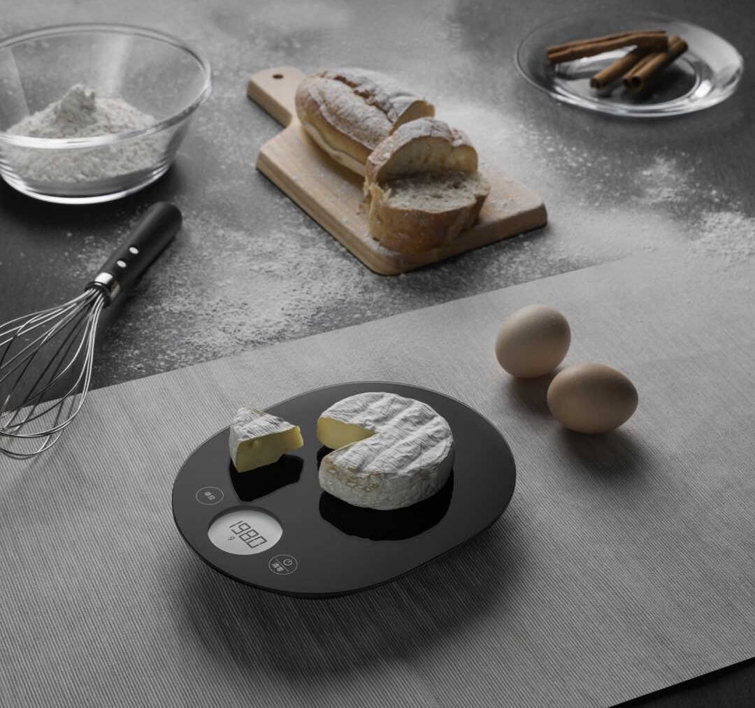 一體式無縫隙鋼化玻璃的秤面,電子廚房秤以0.1g為最小單位,麵包烘焙的秘方就在精準的測量,提供二種測量精度,在1至3公斤的區間可以1公克為單位,低於一公斤的測量度時可切換至0.1公克來秤。供電採用2顆4號電池(AAA),當電力不足20%時廚房電子秤低電量的圖標會閃爍。