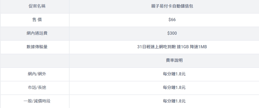 續2點,本方案必須同意綁定自動儲值「$66元親子易付卡自動儲值卡包」,內含購買1GB(量到降速1mb吃到飽)數據傳輸量/效期31天及贈送300元網內通話費/效期31天。贈送之300元網內通話費,逾期未使用完畢之部分將歸零,不得要求退費或轉至其他遠傳門號使用,內含購買1GB(量到降速1mb吃到飽)數據傳輸量,使用效期31天。