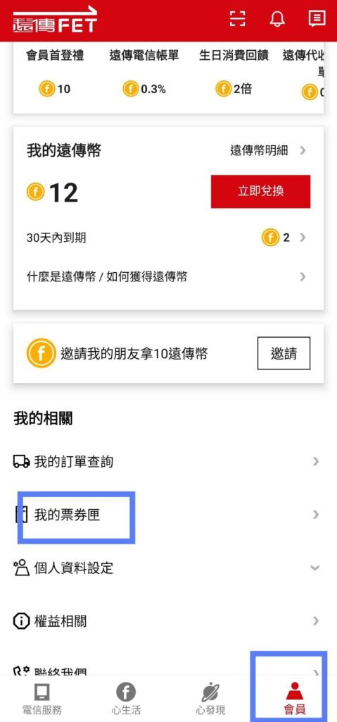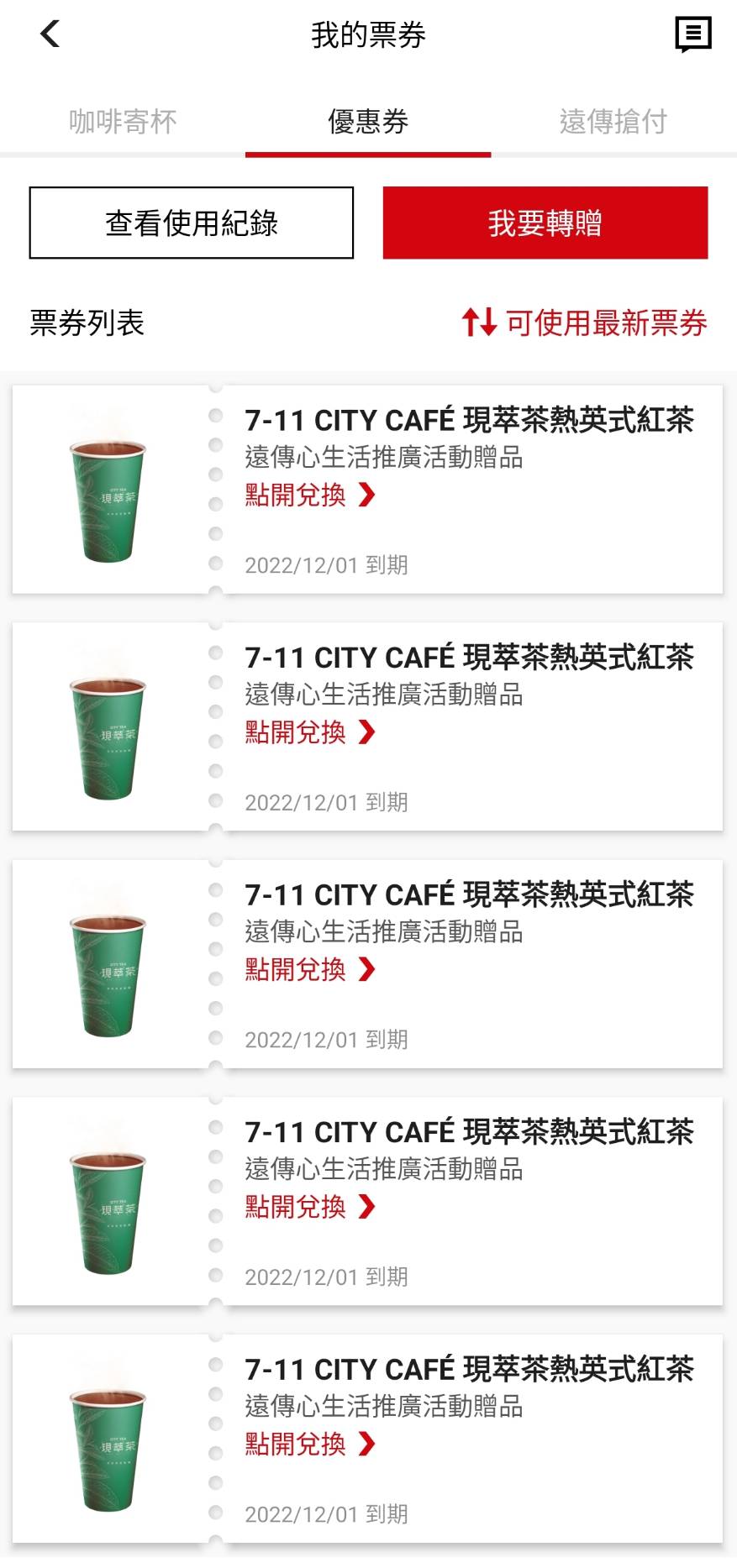 申辦過程門市服務人員會協助開通門號,並在遠傳心生活APP內(會員>我的票券夾>優惠券)可看到門市請你喝一杯7-11鮮萃茶英式紅茶,底下的照片我已經經過轉贈方式到主帳號內。