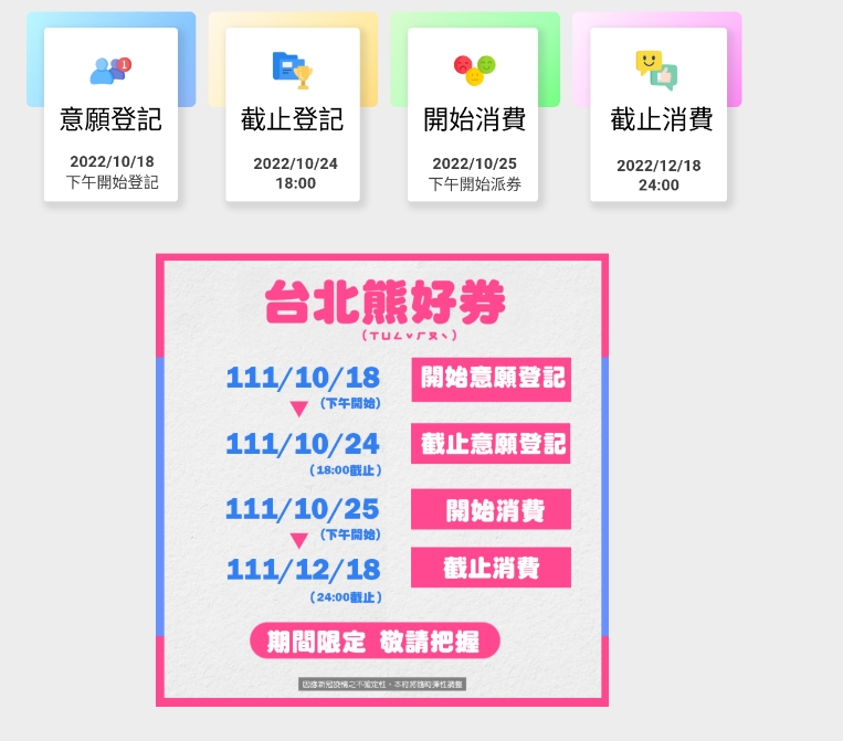 北市府18日舉辦「熊好券2.0」登記起跑記者會,登記方式採多元通路,除現有之「台北通APP」外,本次新增可透過健保卡、自然人憑證、台北通(卡)會員,上網登記(登記網址:https://tpservice.gov.taipei/);此外,北市府與統一便利超商合作,民眾亦可於ibon機完成意願登記,本次活動將首度啟動虛擬等候室的排隊機制,在同時登記人數較多時,台北通將自動開啟排隊機制。