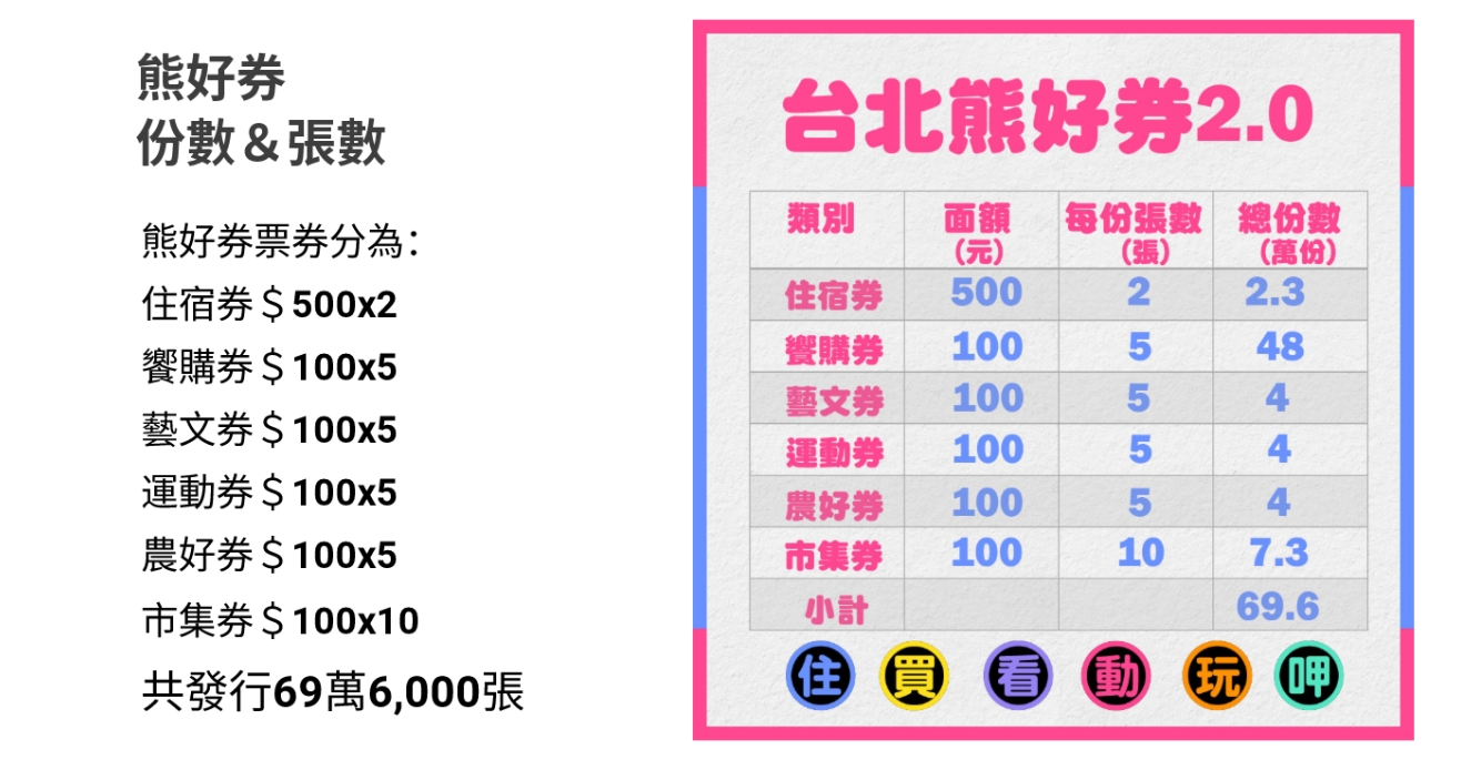 包含住宿券、饗購券、藝文券、運動券、市集券、農好券,共計6種票券,發行69.6萬份