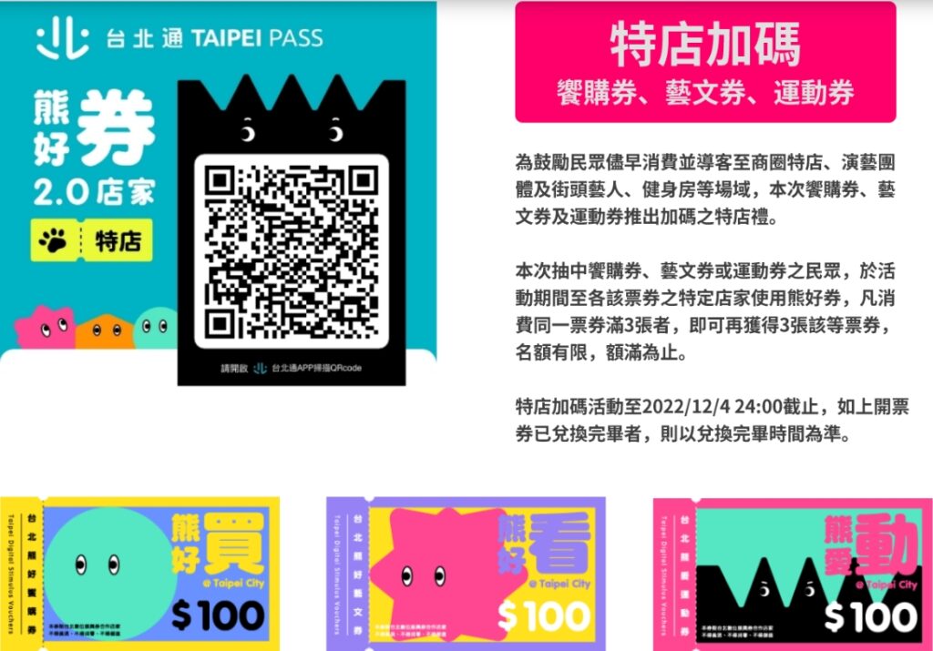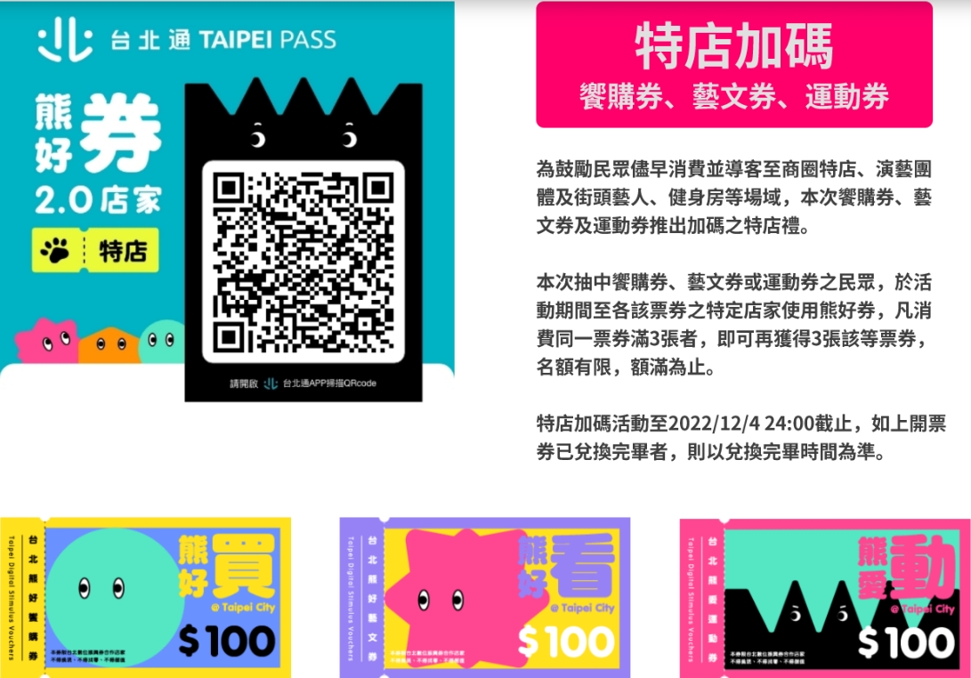 為鼓勵民眾儘早消費並導客至商圈特店、演藝團體及街頭藝人或健身房等場域,本次饗購券、藝文券及運動券將推出加碼之特店禮。抽中饗購券、藝文券或運動券之民眾,可於活動期間至各該票券之特定店家使用熊好券,凡消費同一票券滿3張者,即可再獲得3張該等票券,名額有限,額滿為止。熊好特店、加碼活動時間,詳情請參閱:https://www.gov.taipei/News_Content.aspx?n=56893BA7C21DA5B4&sms=16