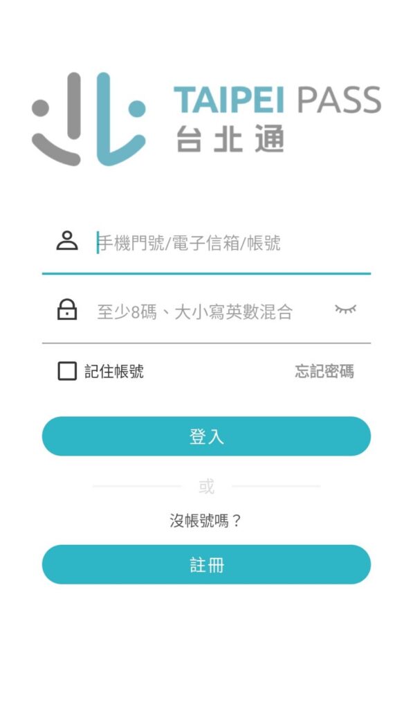 登入台北通APP後跳出登入帳號畫面,如果沒有帳號的請先點選註冊