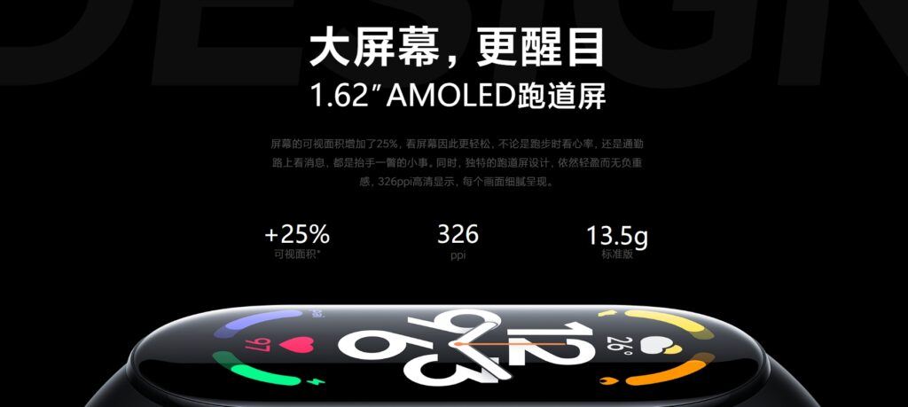 1.62″ AMOLED跑道屏,比過去幾代螢幕更大25%,重量僅有13.5g,並且有326ppi螢幕解析度