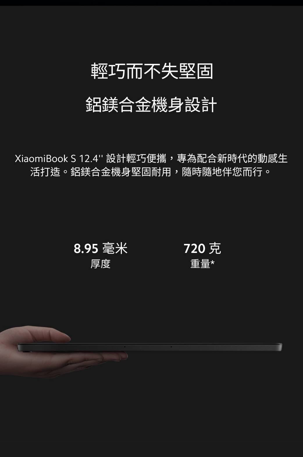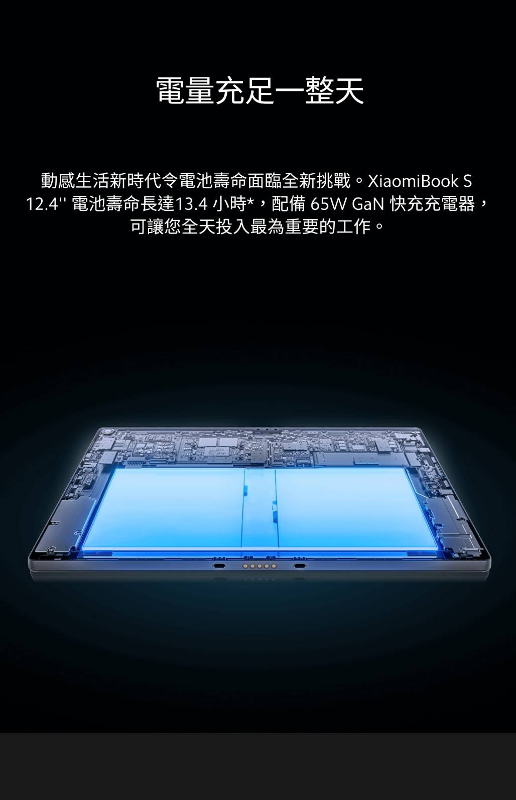 Xiaomi Books 12.4″電池續航力為13.4小時,搭配65W快充,可滿足一天重要的工作,另這款主要訴求是輕薄好攜帶,鋁鎂合金技術,整機重量僅有720公克以及8.95毫米的超薄厚度。