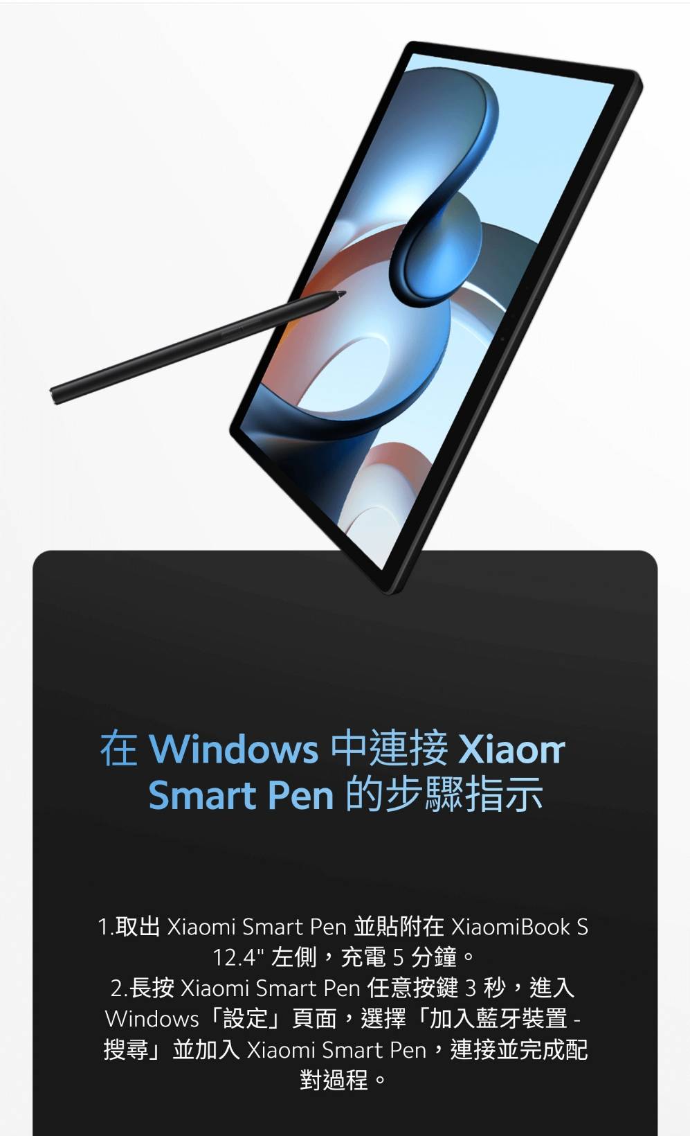 觸控筆磁吸在Xiaomi Books 12.4″左側,藍牙配對後即可使用