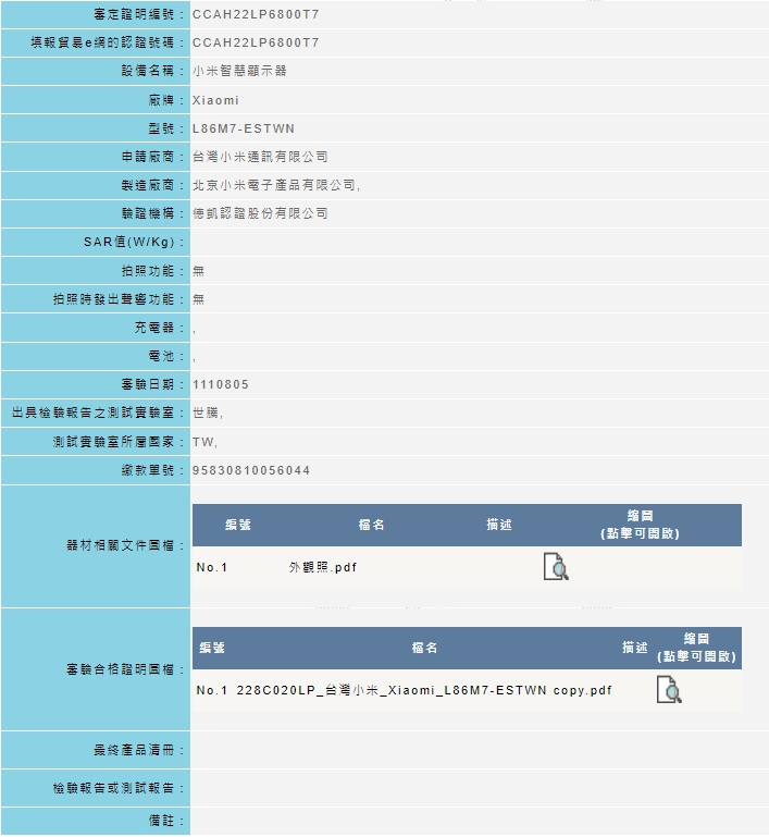 電視目前有65型、P1 55型、P1 50型以及新款的 A2 55型和A2 43型,現在又在8/5通過了NCC,一款型號L86M7-ESTWN的86吋電視。